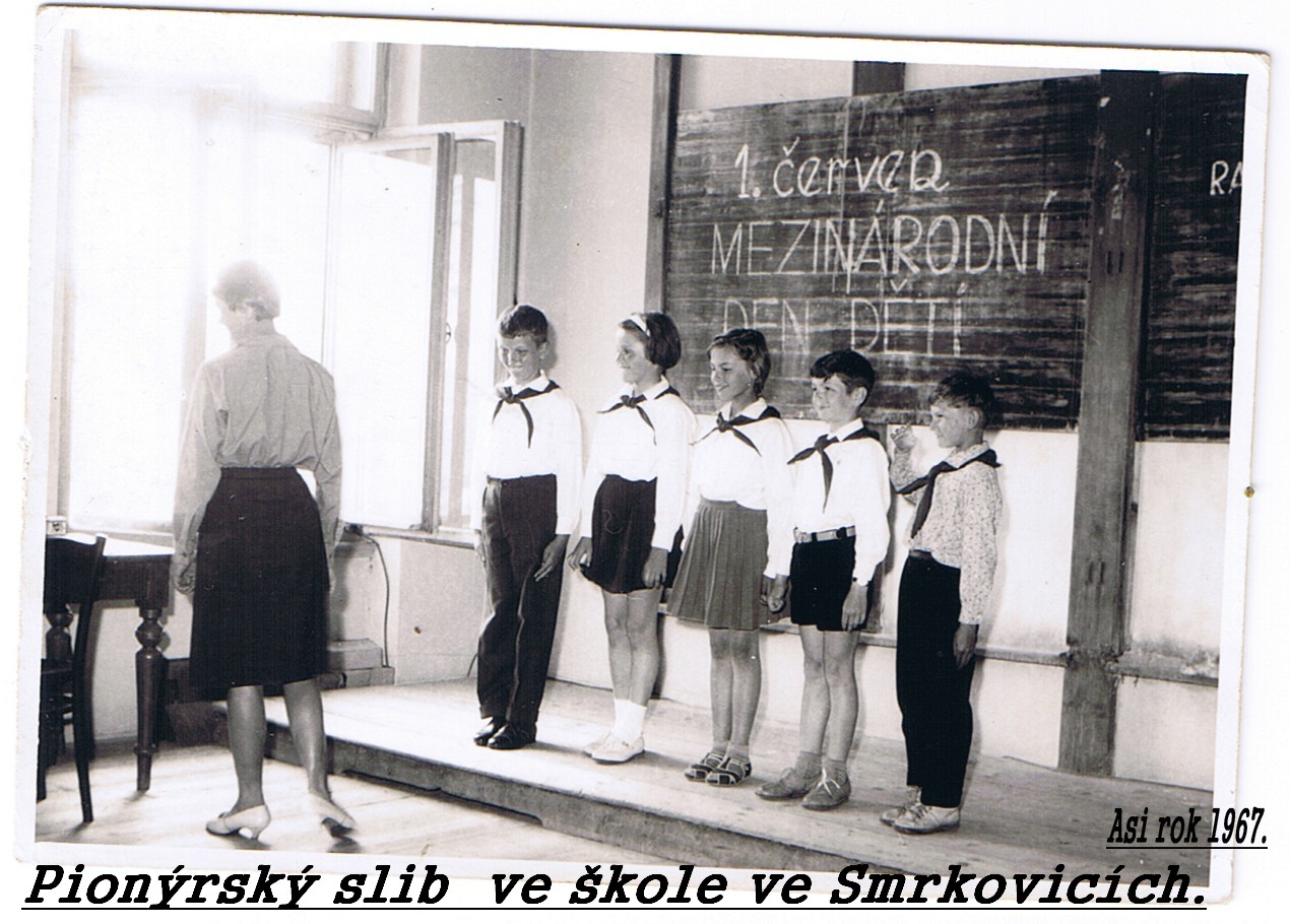 Zaslala Paní Polanská. Pionýrský slib ve škole ve Smrkovicích. Asi rok 1967.